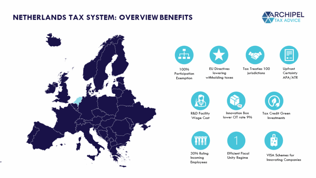 Having your HQ/Top Ops in the Netherlands, will enable access to the Netherlands’ extensive Tax and Bilateral Investment Treaty Network [intra-group & shareholders], stable legal system and strong reputation as a European hub. Compared to many other European jurisdictions, the Netherlands offers a relatively low corporate income tax rate, with a progressive rate structure that starts at 19 % and rises to 25.8 % for profits above €200,000. Beyond the nominal rates, the Dutch tax framework is known for its business-friendly approach, offering various incentives and reliefs that appeal to internationally active companies. We highlight the three most important features of the Dutch tax system for international companies: