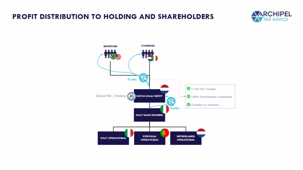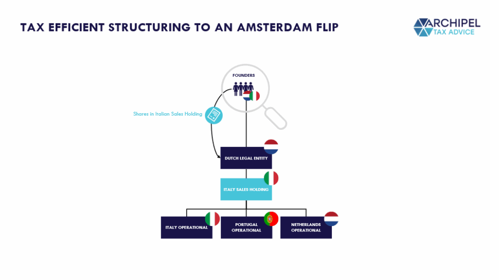 From a tax structuring perspective, you need to make sure that the transfer of the shares in the starting holding company, will be tax efficient for the existing shareholders. In our example: when the Italian and Dutch Founders transfer shares in the Italian holding company to a newly incorporated Dutch holding company in exchange for shares in the Dutch entity, this is generally treated as a share-for-share exchange which can be tax-facilitated within the EU and guided internationally.